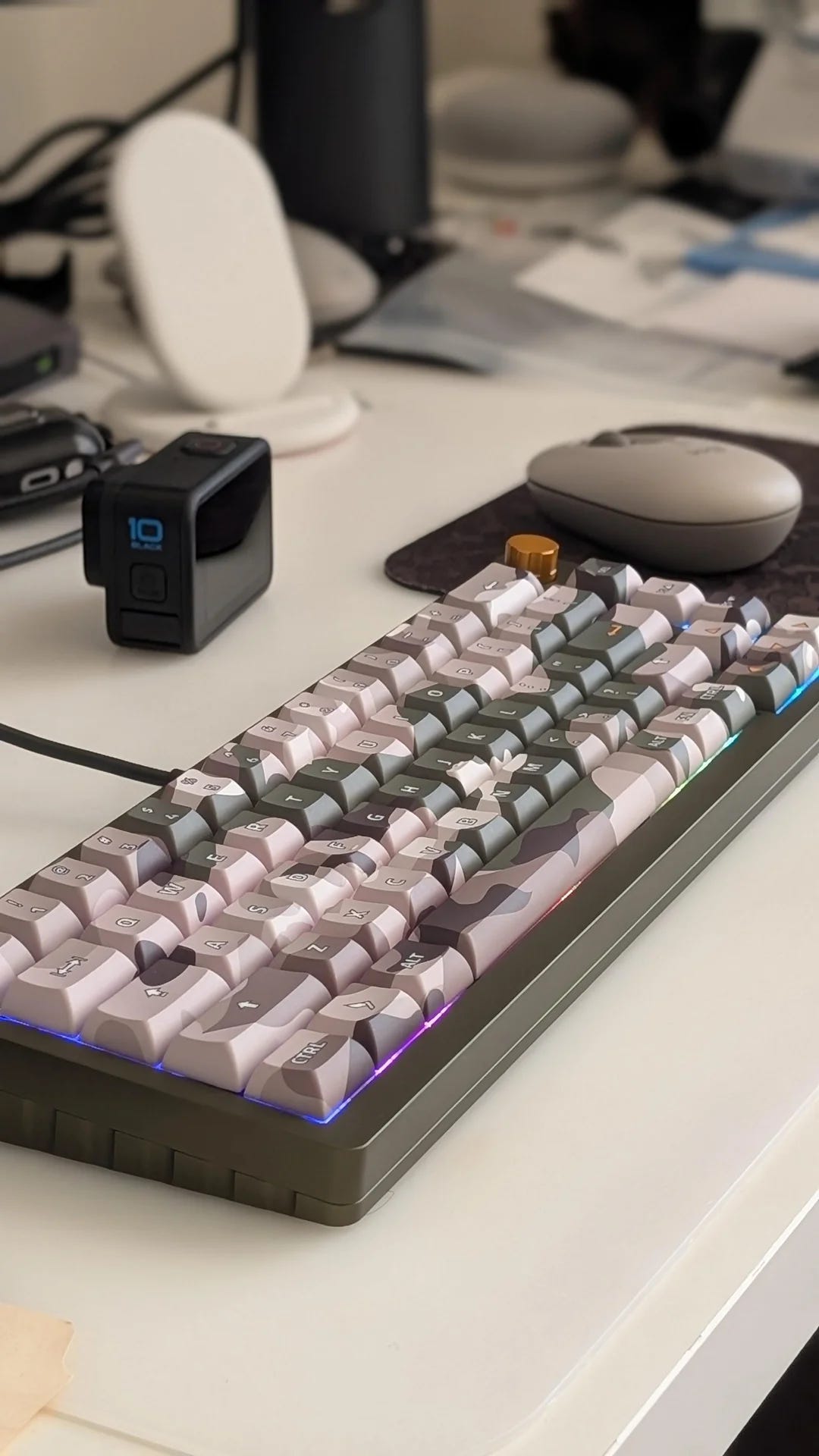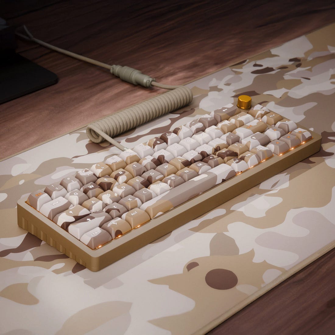 The keycaps are made of thick PBT and use true dye-sublimation to apply camo designs on all five sides. These are not stickers or thin surface prints. They will not fade or wear down. The KCA profile strikes a good balance between modern flatness and comfortable typing height, with a slightly shorter key travel that feels quick without being abrupt. I also like the color offerings including Cyber (the black I have), Urban (a dark blue), Desert (tan), and Jungle (green). The names are little on the nose but they’re cute.