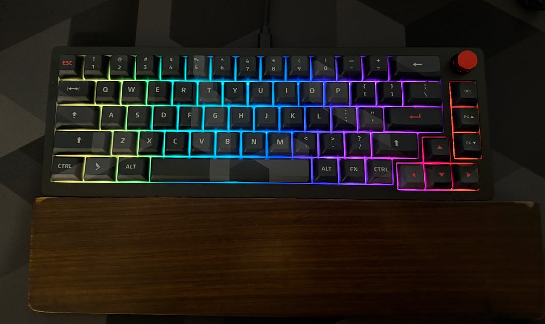 The frame is CNC-milled aluminum, giving it real weight and strength. The gasket mount structure and three layers of sound-absorbing material (two poron, one IXPE) create a clean, muted typing sound that feels controlled without being too soft. While I love a clicky keyboard, I’ve found that I now like something with a little less noise. This fits the bill. Typing is firm and consistent, not hollow or rattling like cheaper boards.