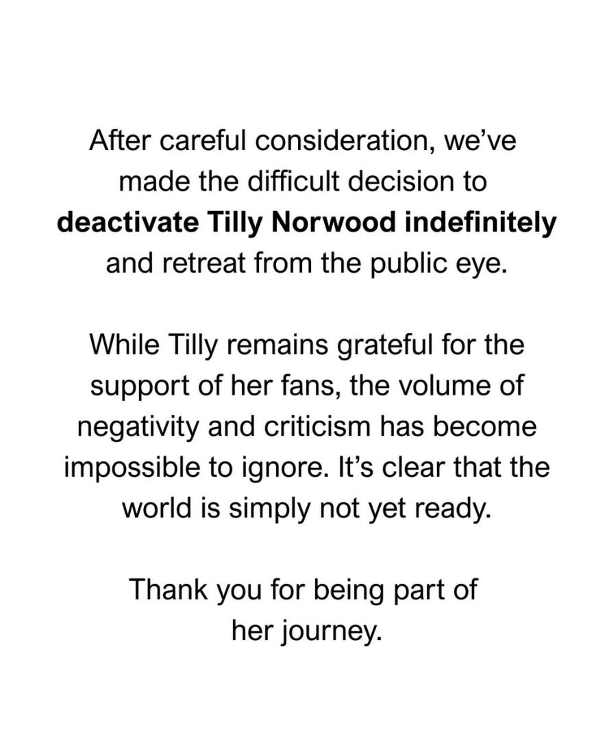 After careful consideration, we’ve made the difficult decision to deactivate Tilly Norwood indefinitely and retreat from the public eye.